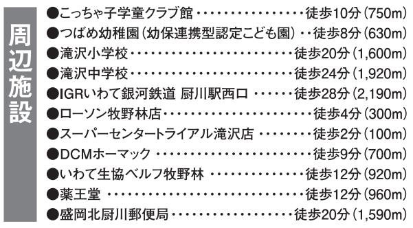 スーパーセンタートライアル滝沢店まで徒歩2分、ローソン牧野林店まで徒歩4分、DCMホーマックまで徒歩9分など大型商業施設が充実しています。