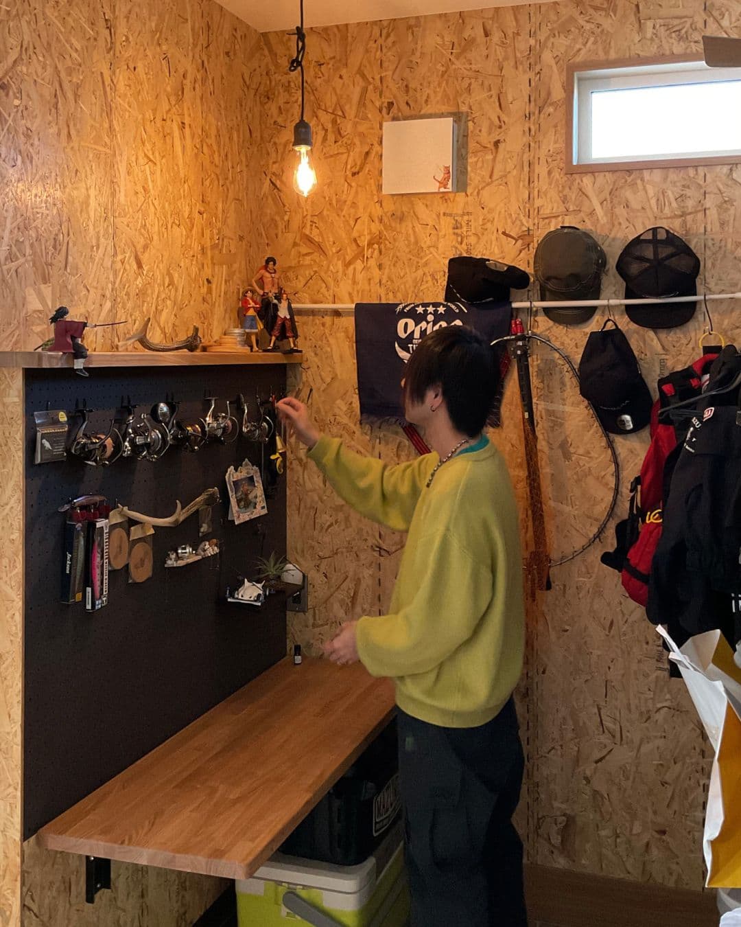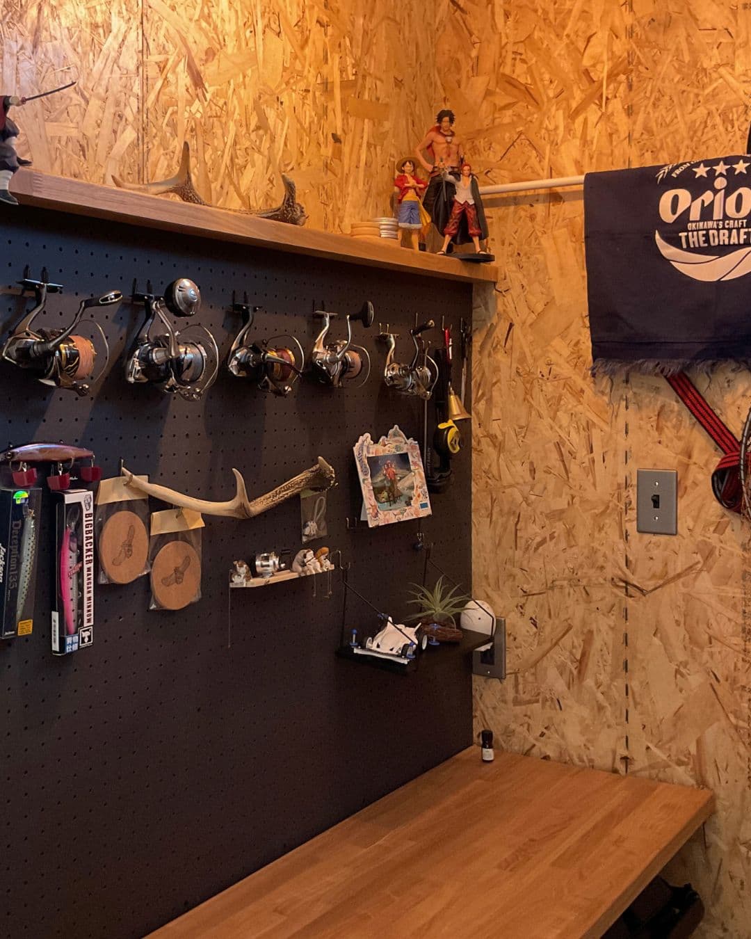 有孔ボードとOSB合板で仕上げたこの空間は、趣味の道具を飾るのにぴったり。