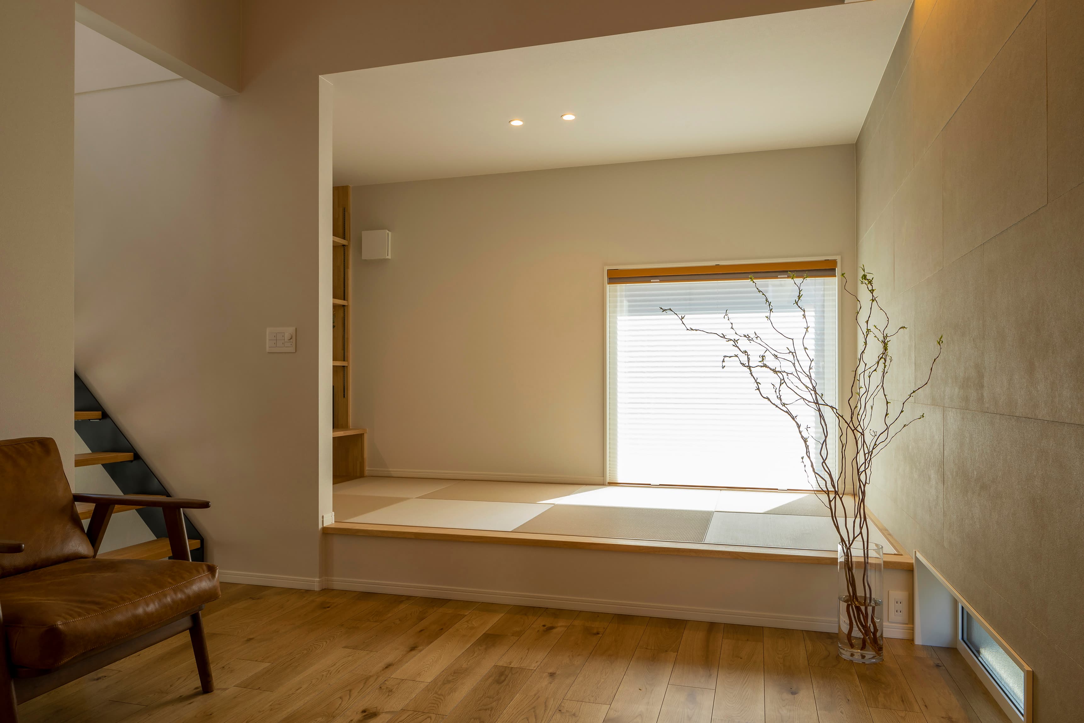 ▲庭を見渡せる小上がりは、寛ぎのセカンドリビング。カウンター付きで趣味や学びにも。