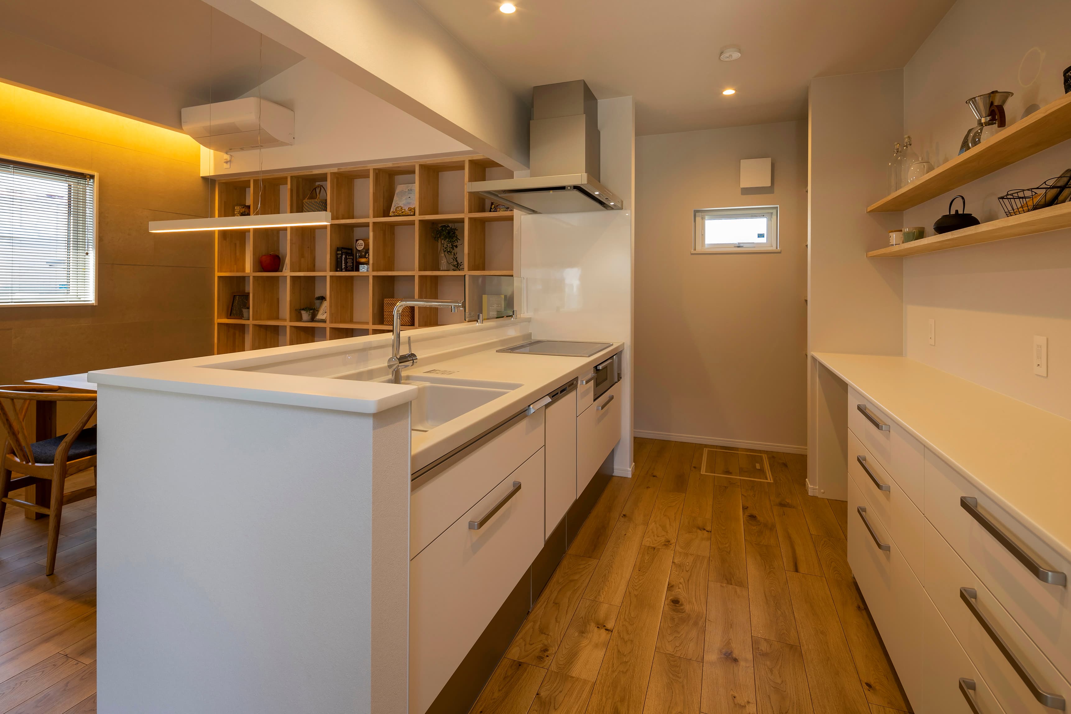 ▲内を見渡せる位置にあるキッチン。エントランスや水回りも近く、家事動線に配慮されています。