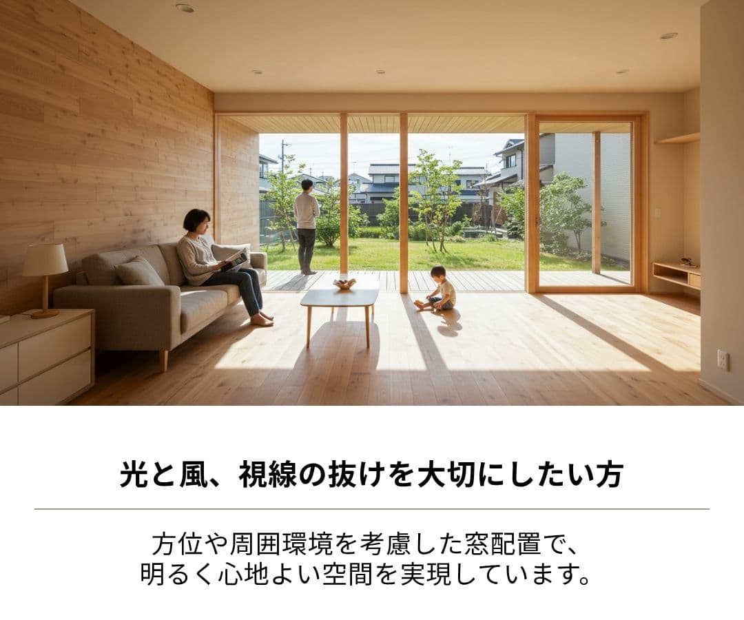 周囲の建物や将来の変化を見越しながら、窓の位置や間取りを丁寧に設計。