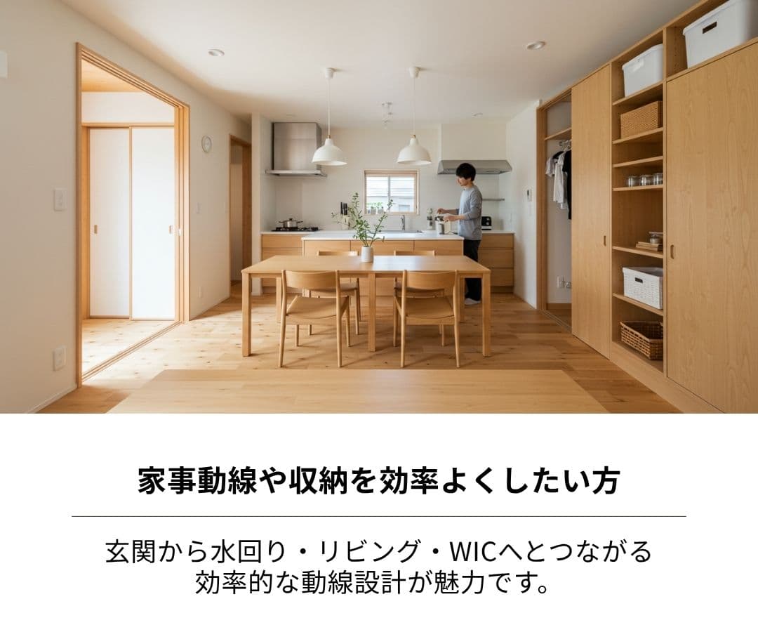 玄関から水回り・リビング・収納へとつながるスムーズな動線設計。ライフスタイルや日々の習慣に寄り添いながら、家具配置や視線の抜けにも配慮しています。