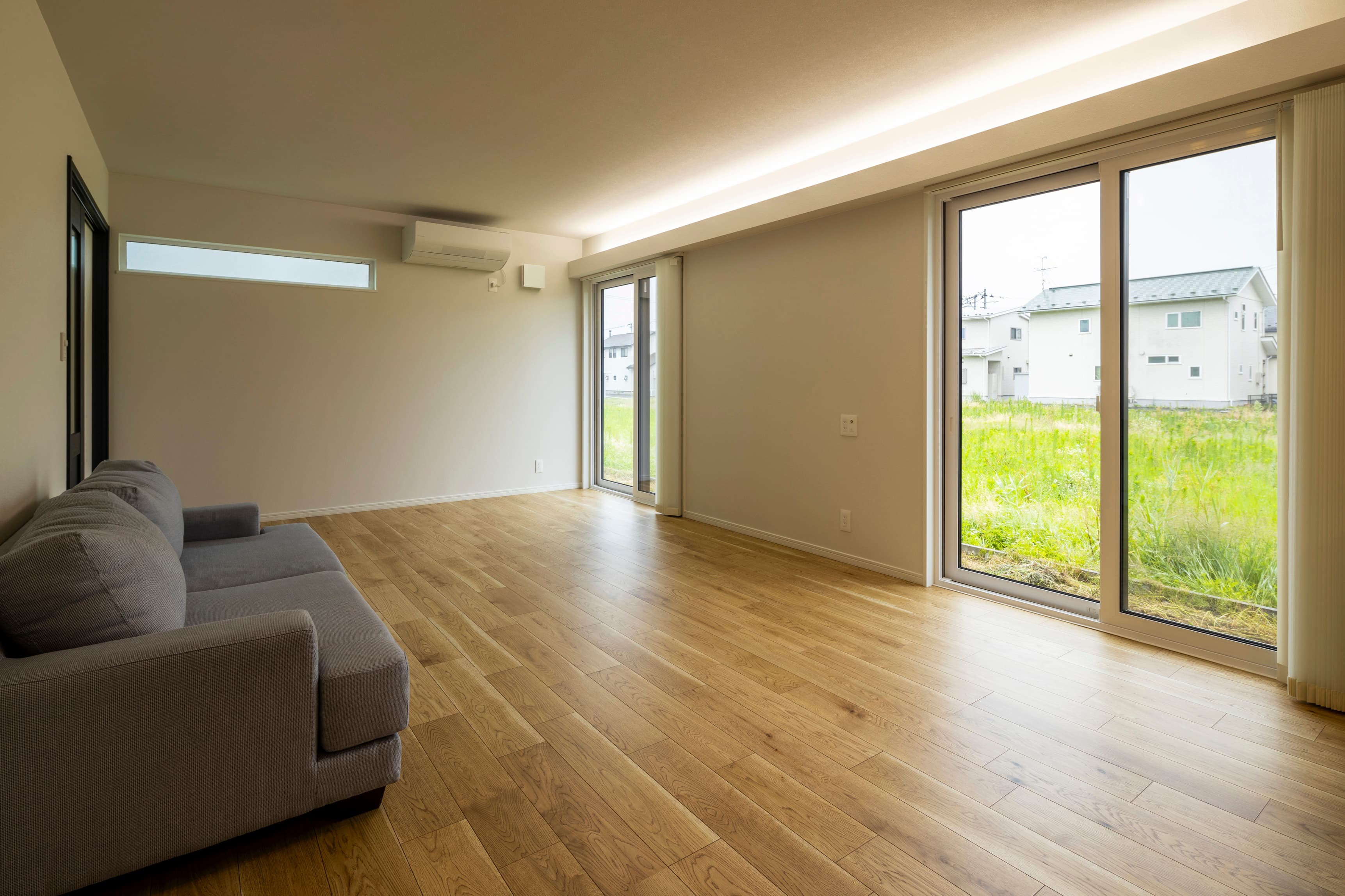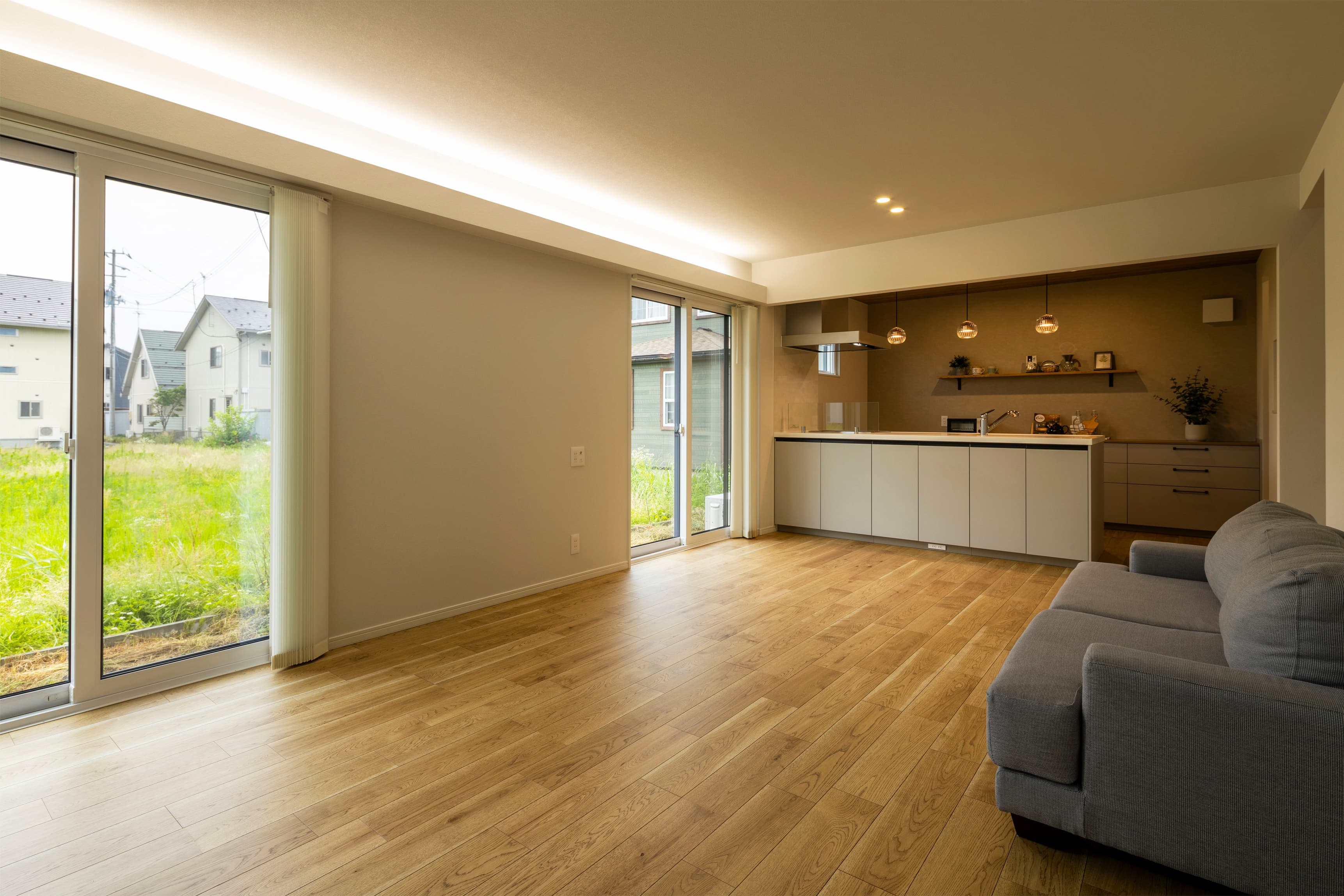 やわらかな光が差し込み、外とのつながりを感じられる心地よい空間。TVの向こうに広がる景色も、ここでは暮らしの一部です。