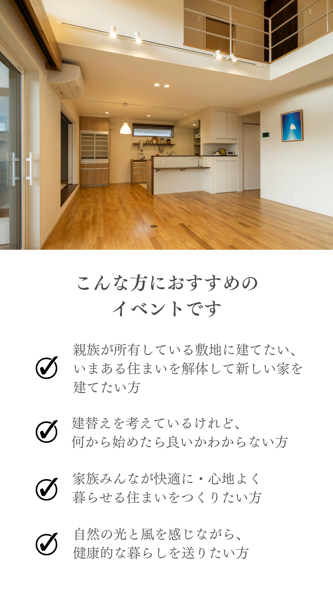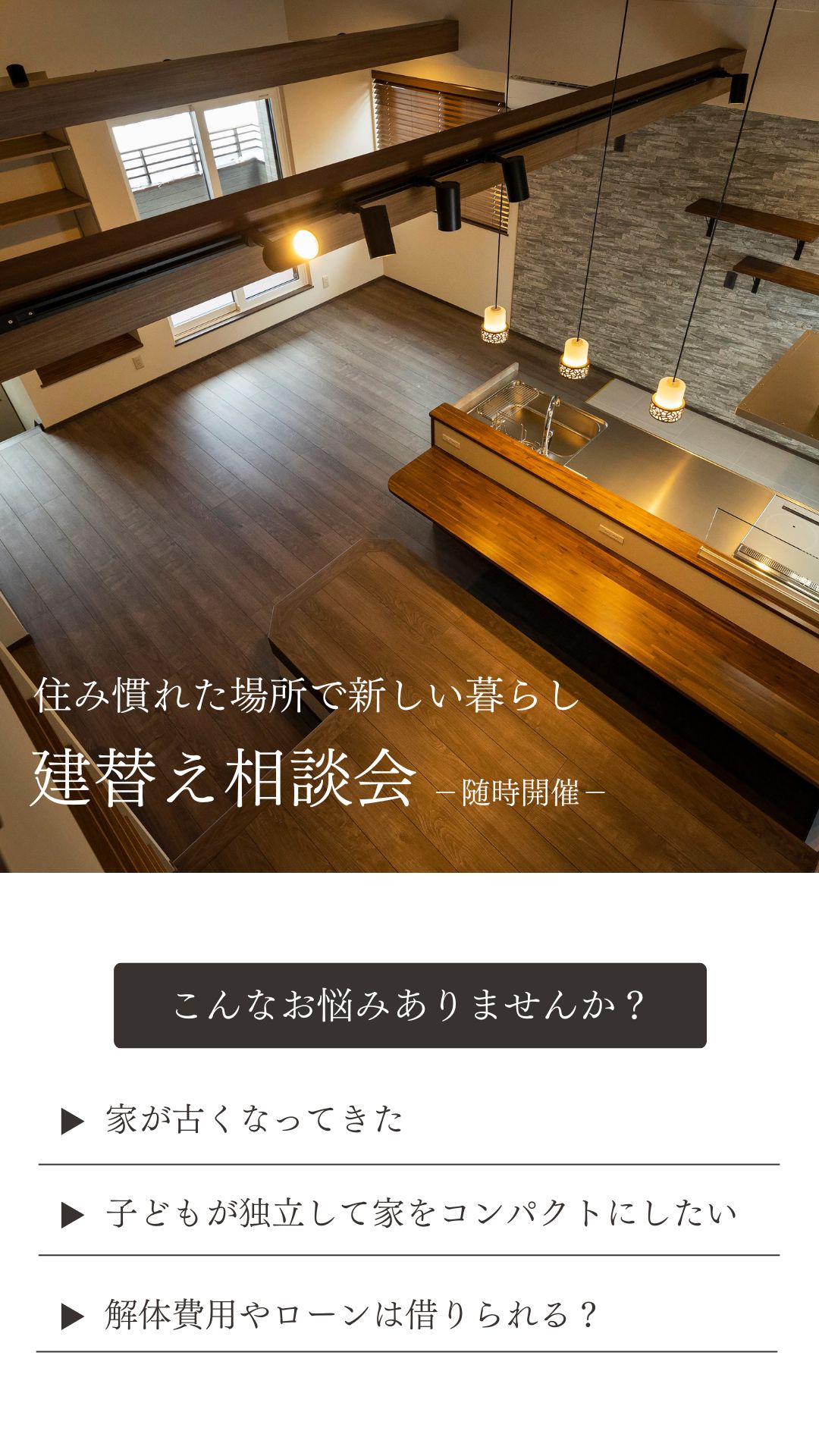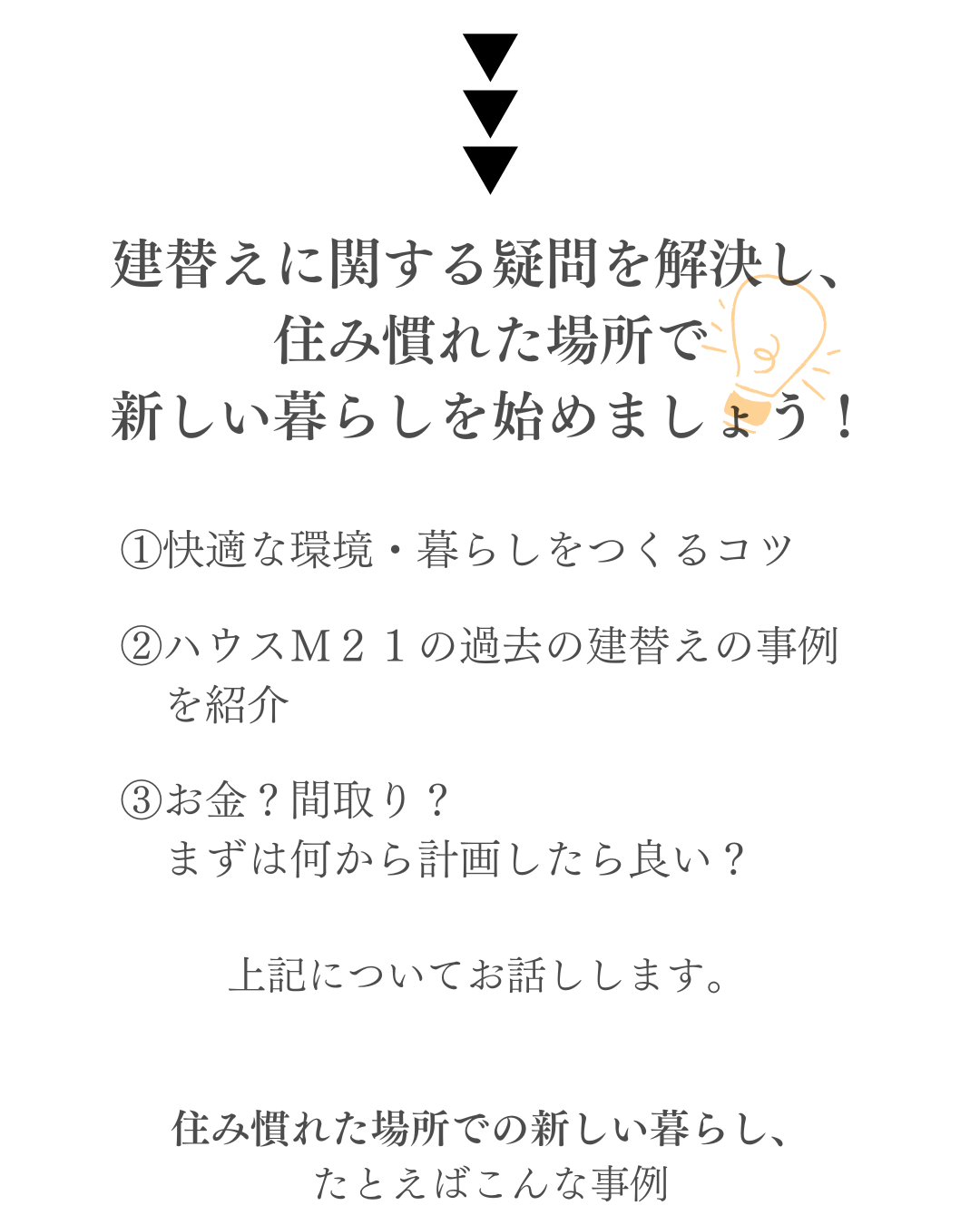 ホーム イベント報告 住み慣れた場所で新しい暮らしを。「住まいの建替え相談会」 ◆終了しました 住み慣れた場所で新しい暮らしを。「住まいの建替え相談会」 日時:※ご希望の日時をご指定ください(事前予約制で実施しております)場所:岩手県盛岡市向中野5-31-8 お申し込み 目次 1 「住まいの建替え相談会」とは? 2 こんな方におすすめのイベントです 3 ハウスM21がつくる住まい 4 よくあるご質問 5 参加ご予約フォーム 1 「住まいの建替え相談会」とは? 2 こんな方におすすめのイベントです 3 ハウスM21がつくる住まい 4 よくあるご質問 5 参加ご予約フォーム ▼ご予約・お問合せはこちら! 滝沢市牧野林モデルハウス 【来場予約受付中】 2階リビングから見渡す四季の絶景岩手山と暮らす家 ご予約はこちらから 北上市しらゆりモデルハウス 【来場予約受付中】 居場所のある暮らしひとりひとりが自分らしく過ごせる家 ご予約はこちらから もっと詳しく知りたい、施工事例が見たい方におススメ HPには掲載されていない写真が多数掲載された施工事例を無料プレゼント♪ ハウスM21の住まいに対する考えや思い、施工事例なを掲載したコンセプトブックをプレゼントいたします。 資料請求はこちら