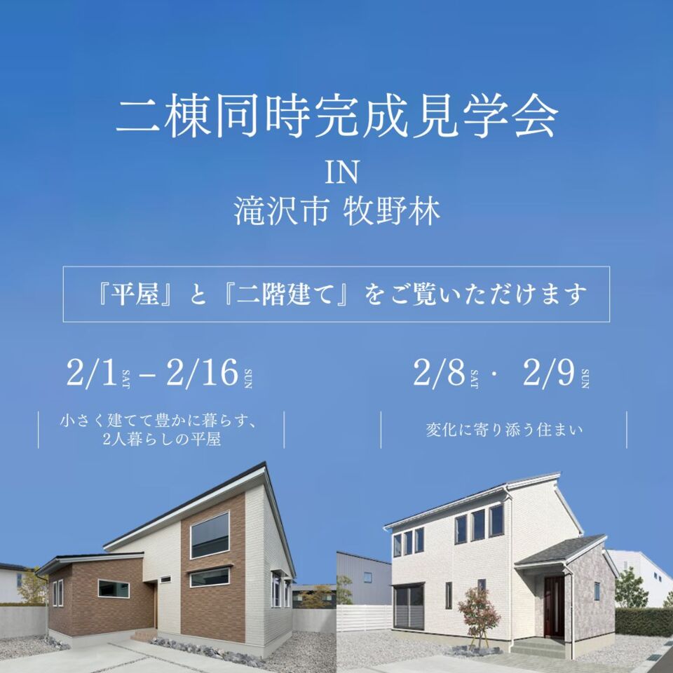 ホーム イベント報告 滝沢市牧野林 2月8日・9日「2つの住まいを体感!平屋・2階建て同時完成見学会」開催 ◆終了しました 滝沢市牧野林 2月8日・9日「2つの住まいを体感!平屋・2階建て同時完成見学会」開催 日時:2025年 2月8日・9日 10:00~17:00場所:滝沢市牧野林 ※ご予約いただいた方に現地をお知らせします。 お申し込み 目次 1 小さく建てて豊かに暮らす、2人暮らしの平屋 2 変化に寄り添う住まい 3 よくあるご質問 4 ハウスM21がつくる住まい 1 小さく建てて豊かに暮らす、2人暮らしの平屋 2 変化に寄り添う住まい 3 よくあるご質問 4 ハウスM21がつくる住まい 現在開催中の各種イベントはこちらからどうぞ! 現在開催中の各種イベント情報はこちらをタップ 滝沢市牧野林モデルハウス 【来場予約受付中】 2階リビングから見渡す四季の絶景岩手山と暮らす家 ご予約はこちらから 北上市しらゆりモデルハウス 【来場予約受付中】 居場所のある暮らしひとりひとりが自分らしく過ごせる家 ご予約はこちらから