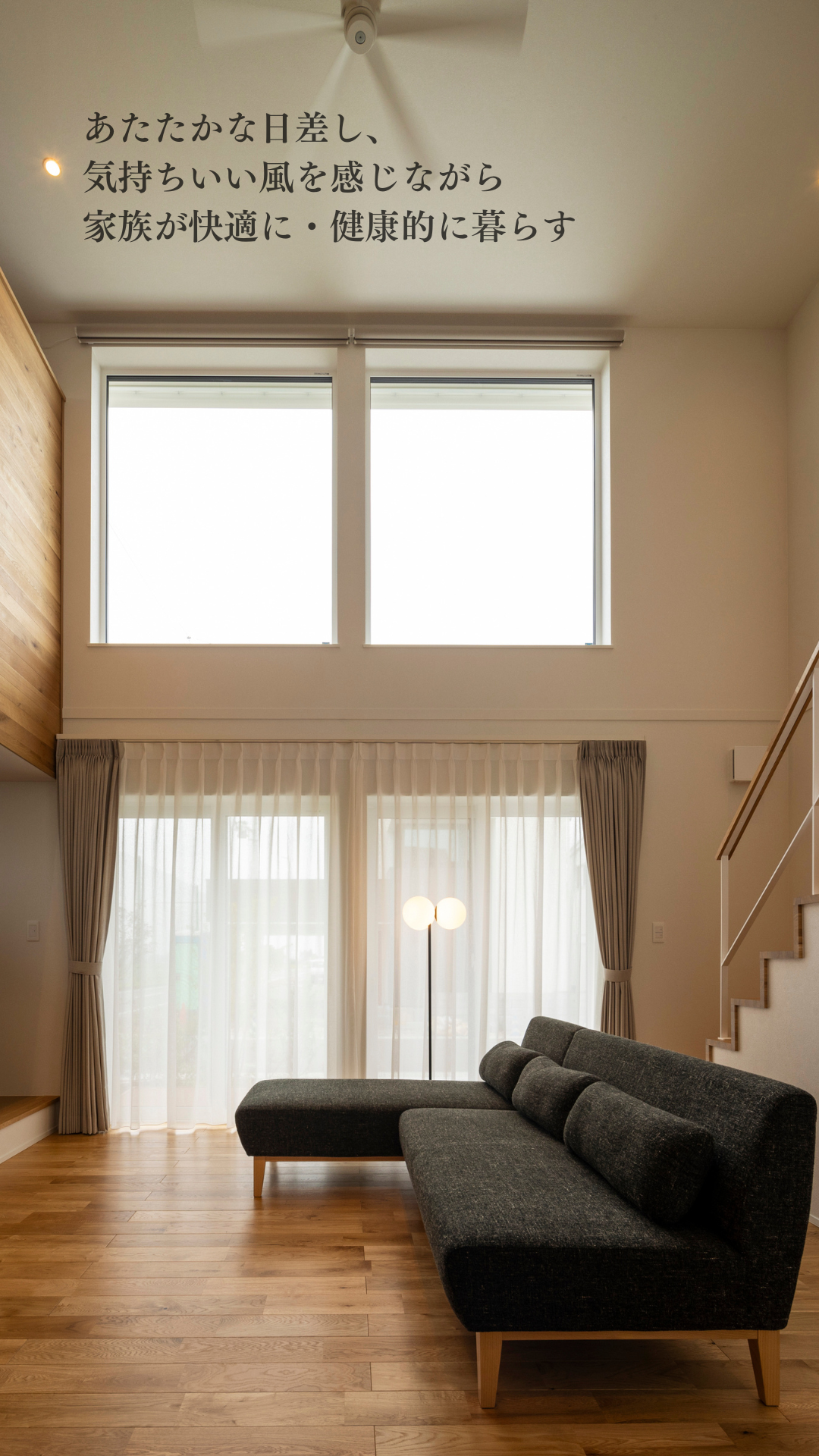 ▲リビングは吹抜けや連続して並ぶ大きな窓によって開放感を感じる、気持ちのいい空間です。