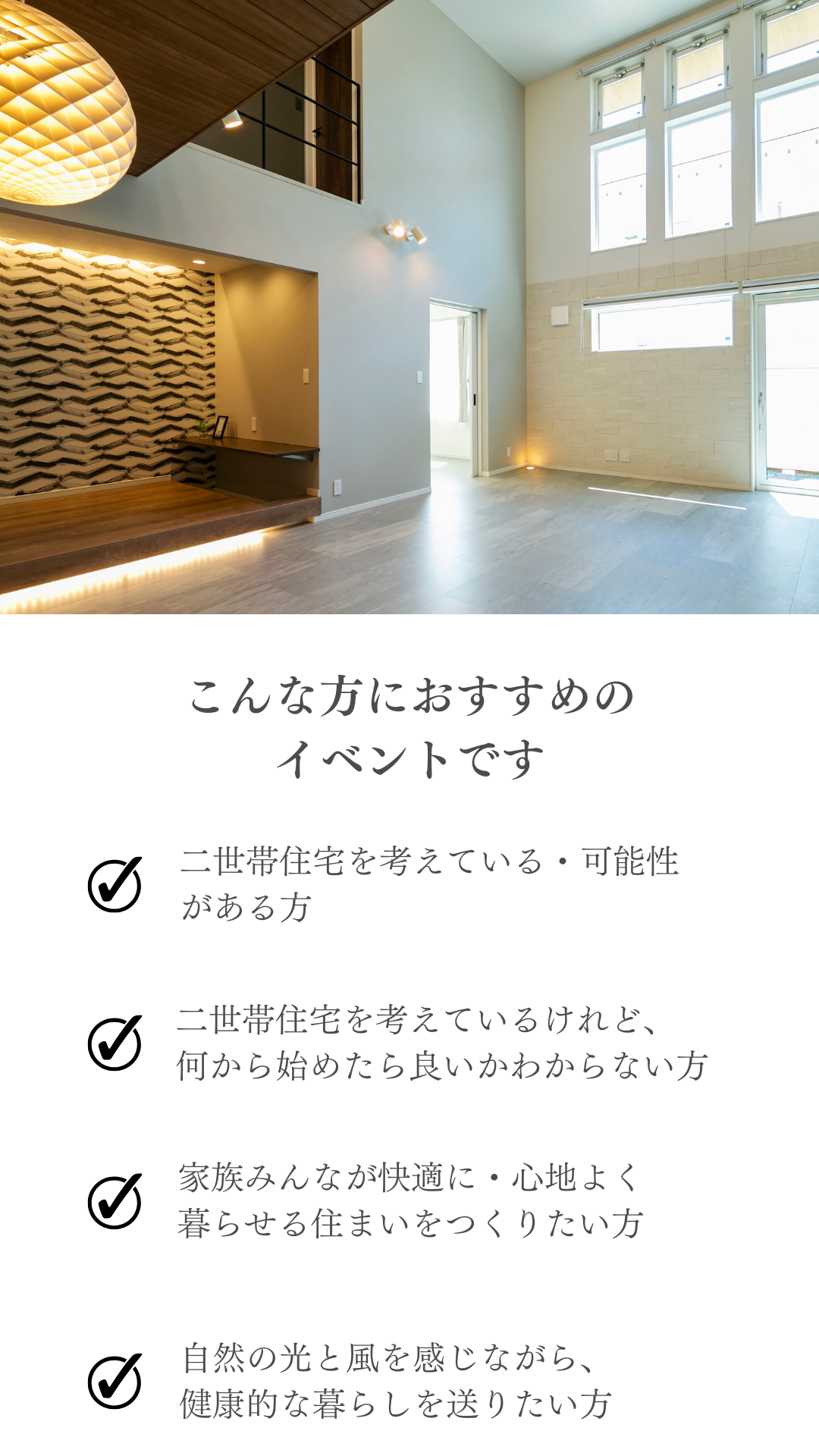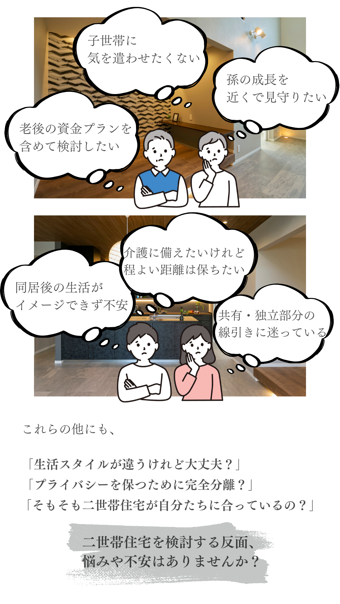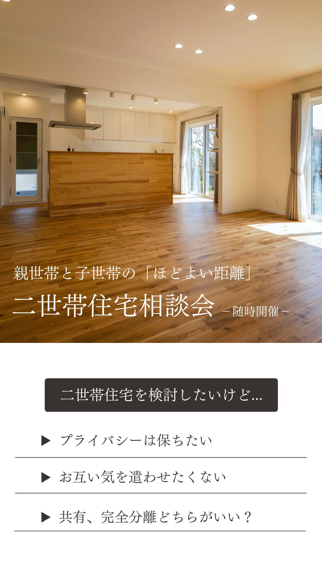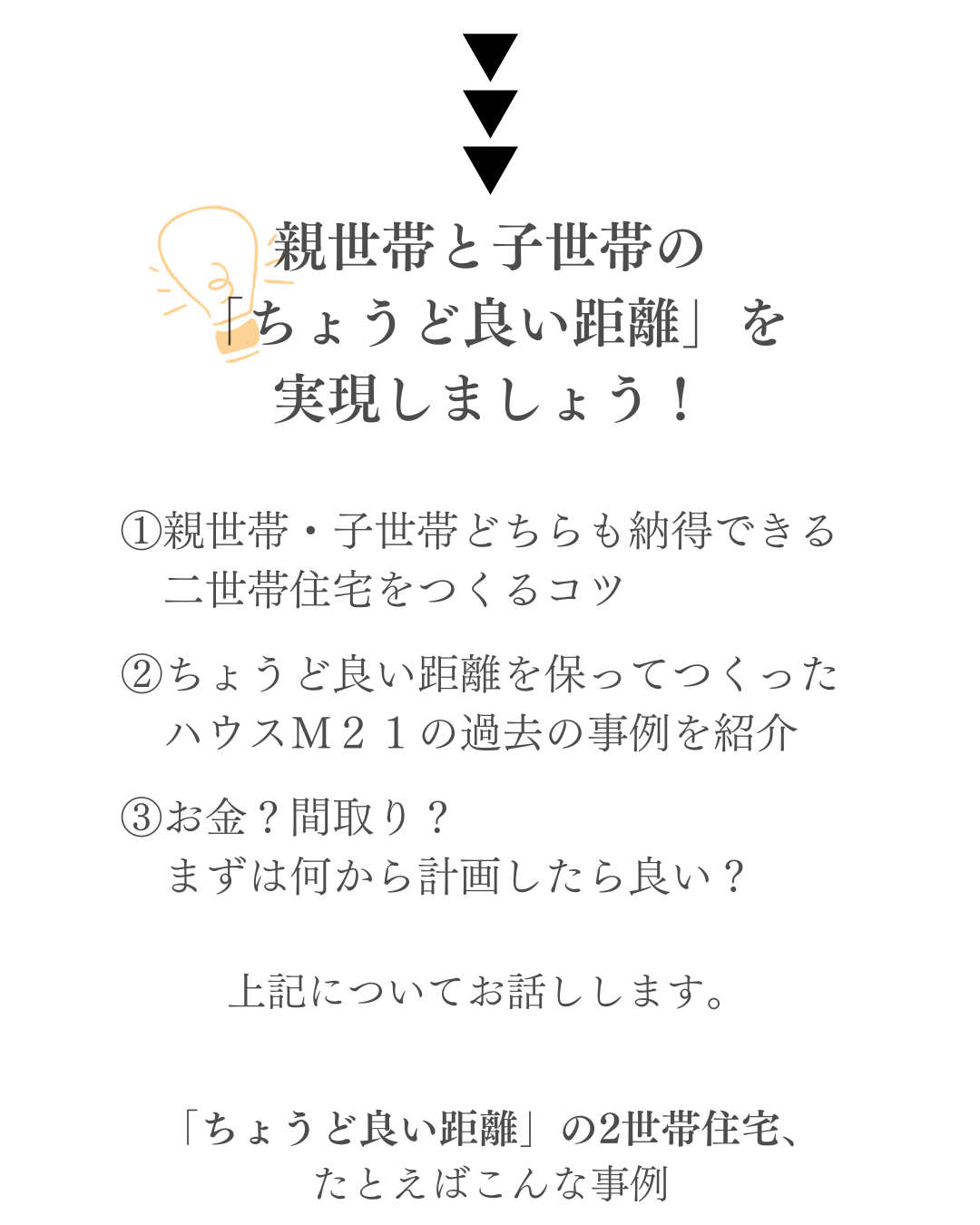 ホーム イベント報告 親世帯と子世帯の「ちょうどいい距離」を実現!二世帯住宅相談会 ◆終了しました 親世帯と子世帯の「ちょうどいい距離」を実現!二世帯住宅相談会 日時:※ご希望の日時をご指定ください(事前予約制で実施しております)場所:岩手県盛岡市向中野5-31-8 お申し込み 目次 1 「二世帯住宅相談会」とは? 2 こんな方におすすめのイベントです 3 ハウスM21がつくる住まい 4 よくあるご質問 5 参加ご予約フォーム 1 「二世帯住宅相談会」とは? 2 こんな方におすすめのイベントです 3 ハウスM21がつくる住まい 4 よくあるご質問 5 参加ご予約フォーム ▼ご予約・お問合せはこちら! 滝沢市牧野林モデルハウス 【来場予約受付中】 2階リビングから見渡す四季の絶景岩手山と暮らす家 ご予約はこちらから 北上市しらゆりモデルハウス 【来場予約受付中】 居場所のある暮らしひとりひとりが自分らしく過ごせる家 ご予約はこちらから もっと詳しく知りたい、施工事例が見たい方におススメ HPには掲載されていない写真が多数掲載された施工事例を無料プレゼント♪ ハウスM21の住まいに対する考えや思い、施工事例なを掲載したコンセプトブックをプレゼントいたします。 資料請求はこちら