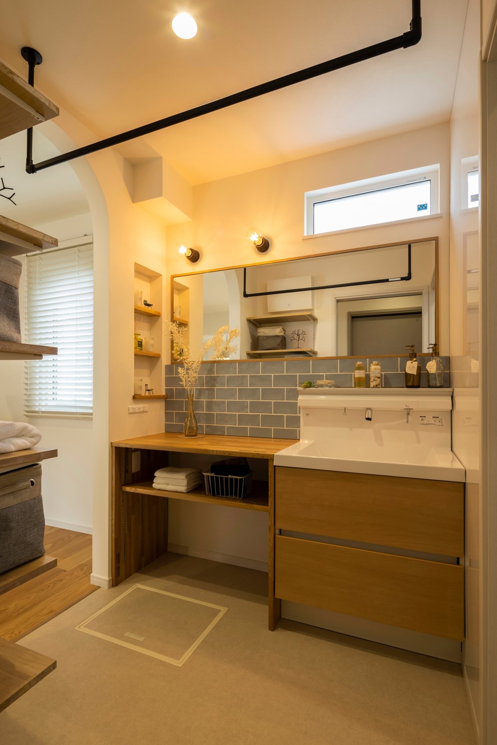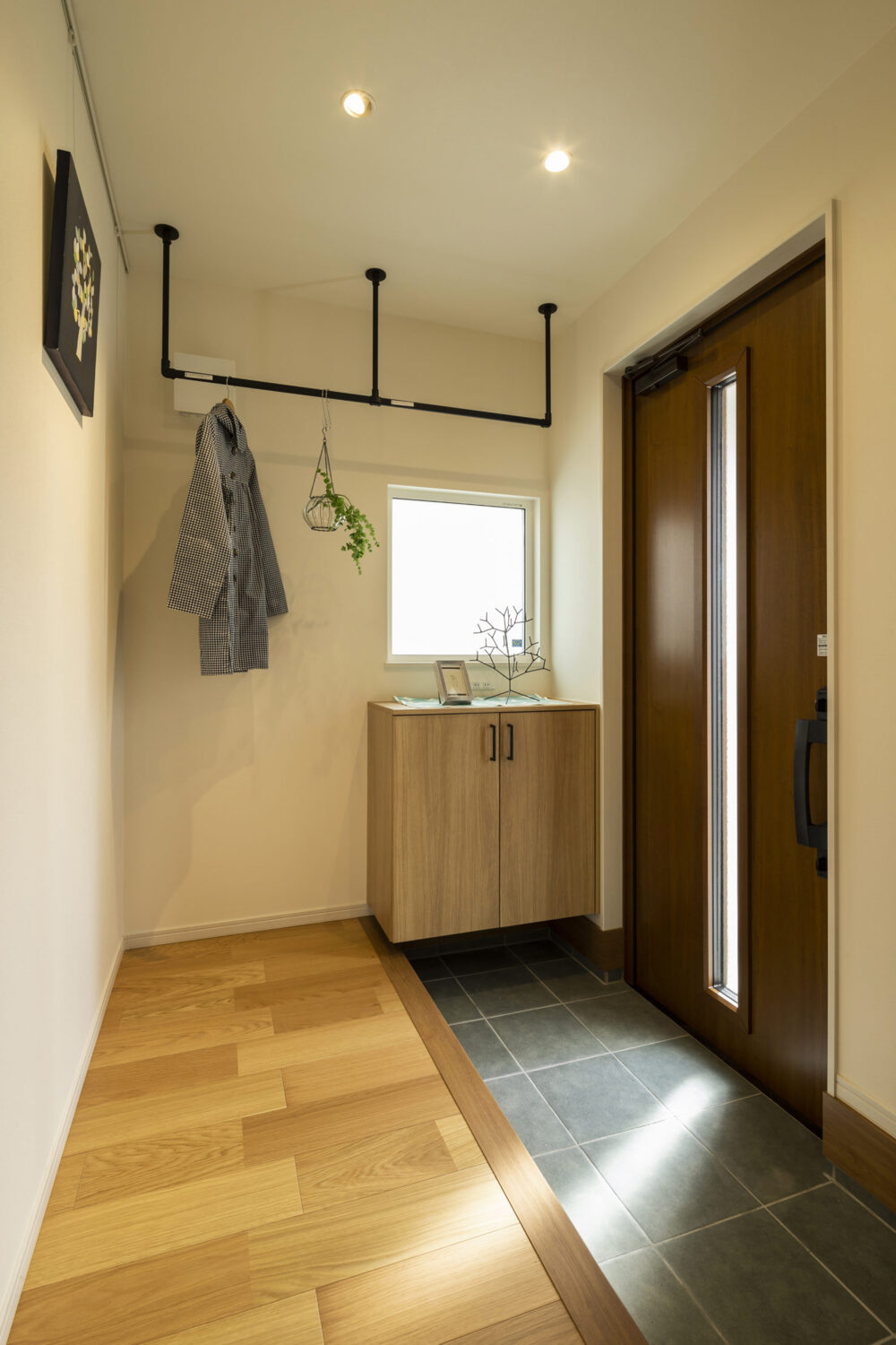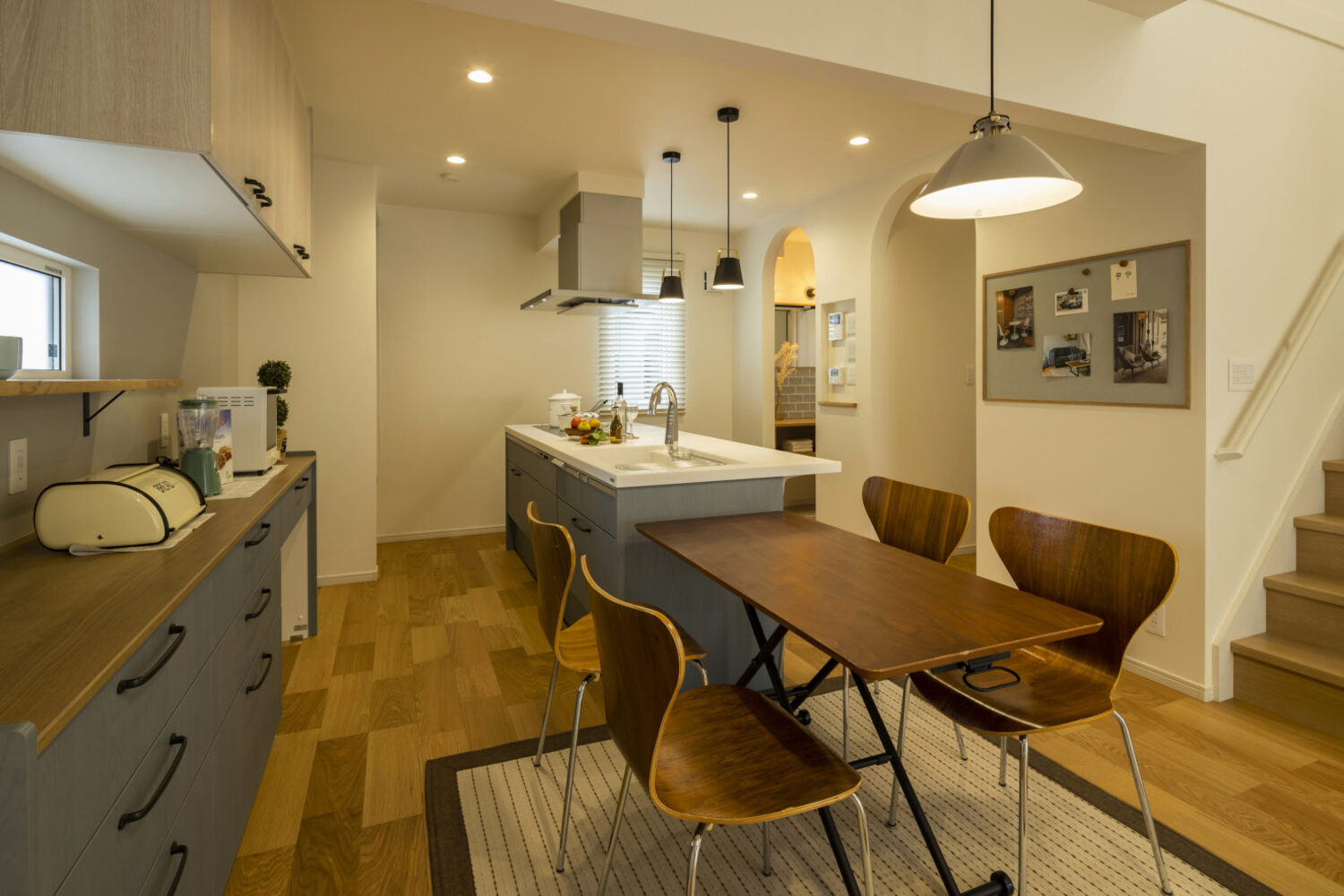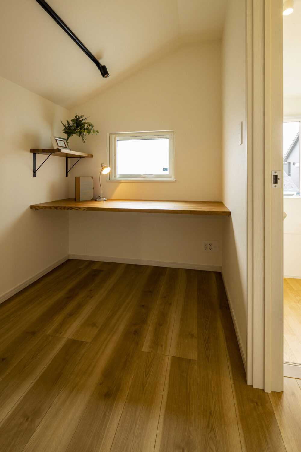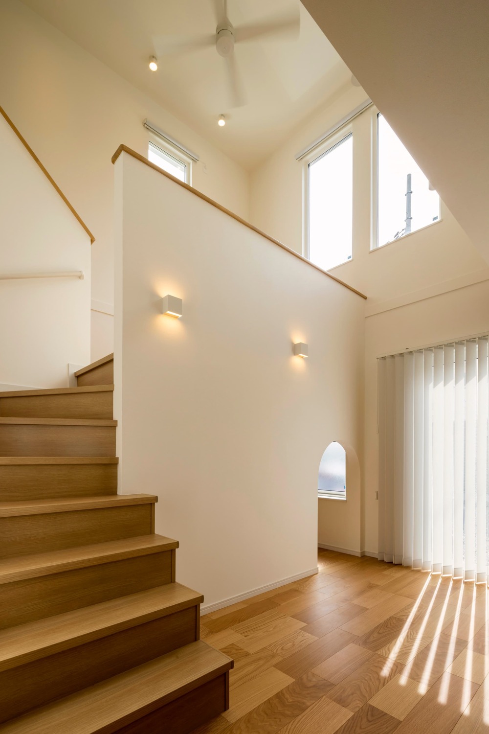 旗竿地に建つ開放的なリビングと趣味を楽しむそれぞれの居場所のある家
